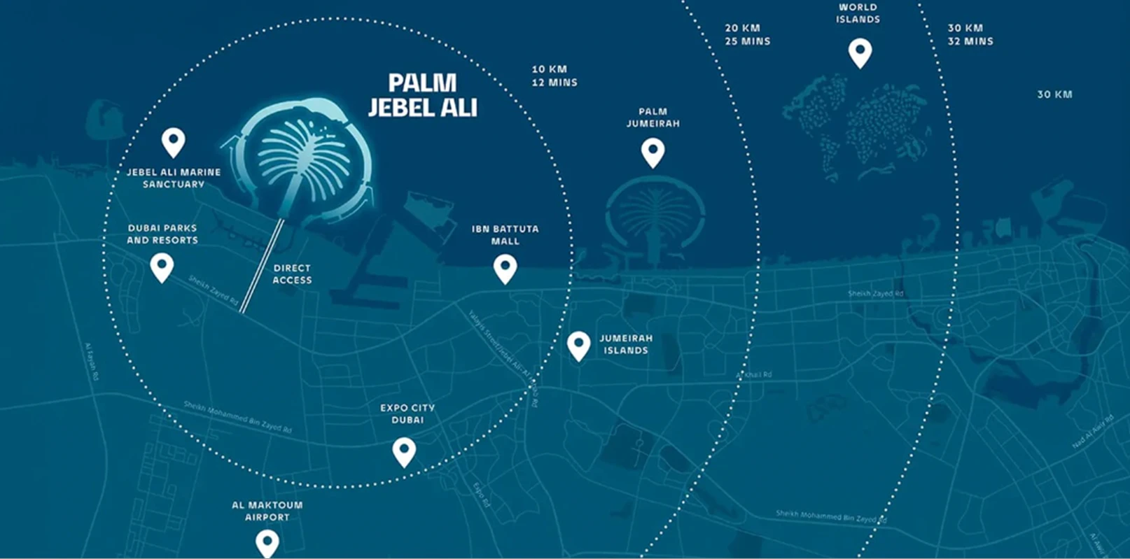 Palm Jebel Ali is strategically located near Sheikh Zayed Road (E11), offering convenient access to key destinations such as Dubai Marina, Downtown Dubai, and Al Maktoum International Airport. Improved infrastructure is planned as development progresses.